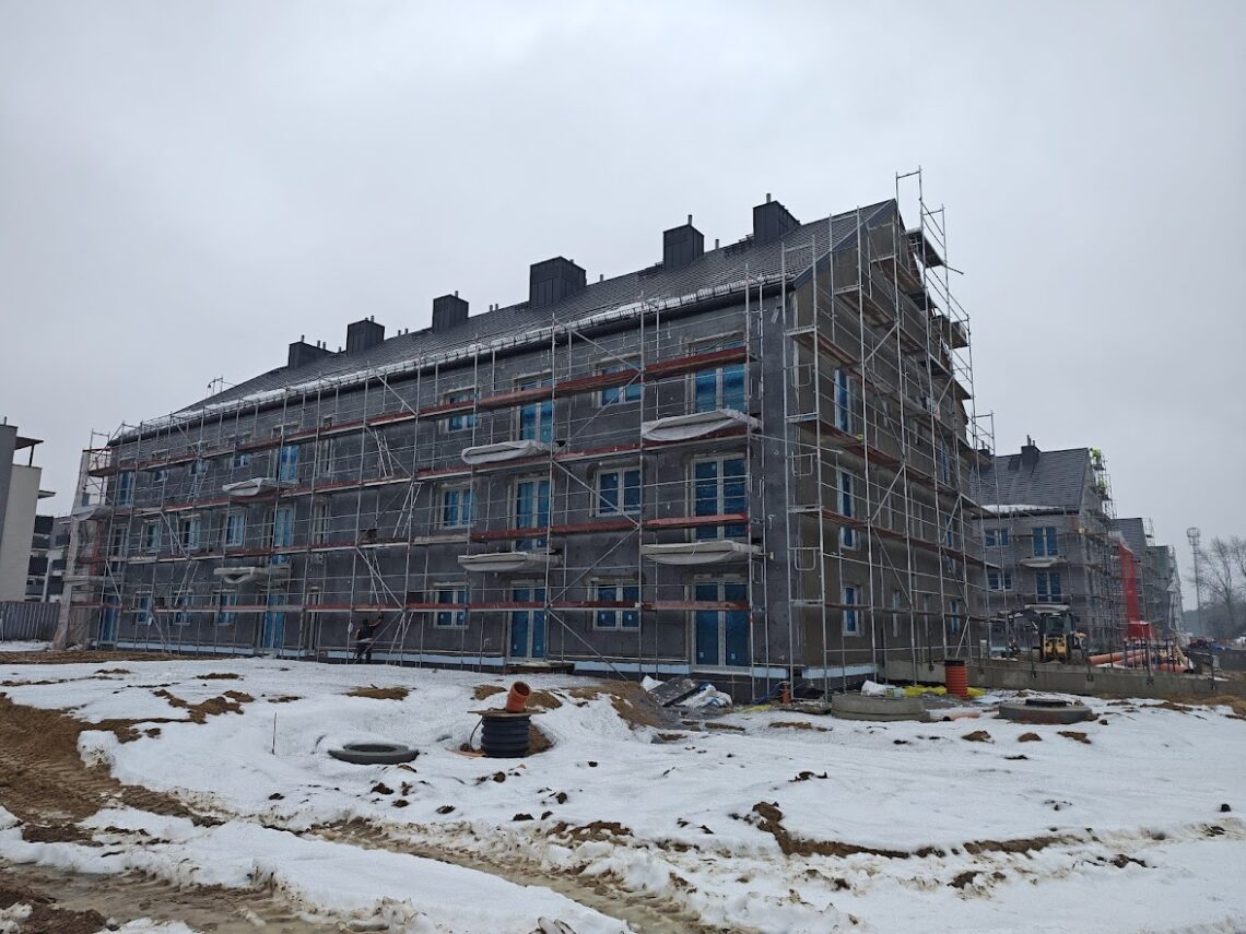 Prace postępują zgodnie z planem. Z zewnątrz budynek coraz bardziej nabiera docelowego wyglądu – widać efekty robót elewacyjnych i zewnętrznych. W środku układ lokali jest już czytelny i przygotowany pod kolejne etapy wykończenia.