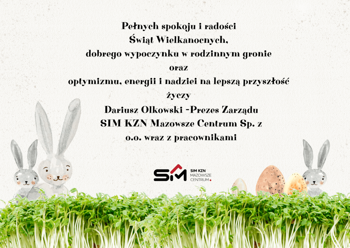 Pełnych spokoju i radości Świąt Wielkanocnych, dobrego wypoczynku w rodzinnym gronie oraz optymizmu, energii i nadziei na lepszą przyszłość życzy Dariusz Olkowski -Prezes Zarządu SIM KZN Mazowsze Centrum Sp. z o.o. wraz z pracownikami
