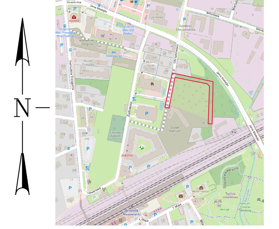 Planowana inwestycja zlokalizowana jest w sąsiedztwie istniejącego budynku wielorodzinnego „Osiedle Platinum”, garażu wielopoziomowego „Park&Ride” i budynku Komendy Powiatowej Państwowej Straży Pożarnej, na terenie nieruchomości przy ul. Chrzanowskiej, na działkach nr 35/1, 44/2, 44/9, 44/10, 44/12, 44/13 w Grodzisku Mazowieckim.